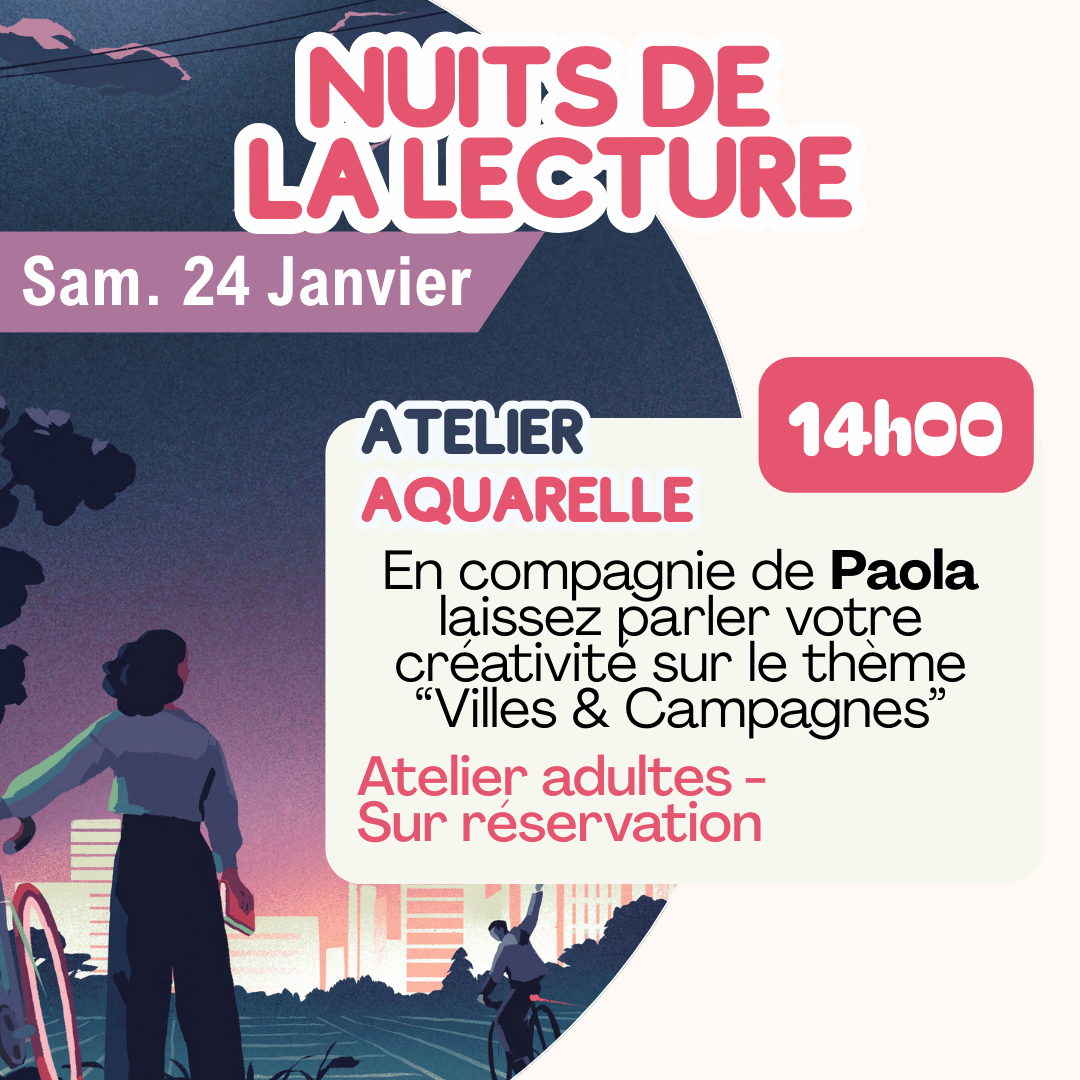 Comme chaque année, la Médiathèque participe aux « Nuits de la lecture » le 24 janvier. 3 temps forts vous sont proposés : atelier aquarelle, club des jeunes, goûter littéraire…